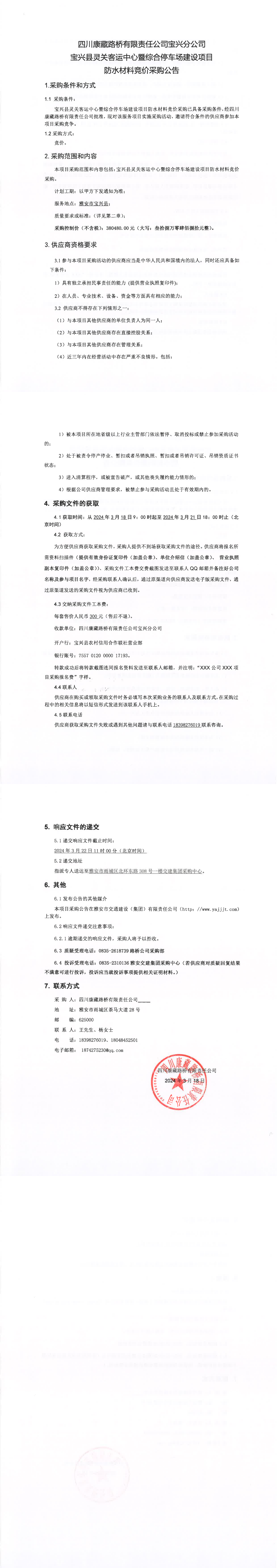 四川康藏路橋有限責(zé)任公司寶興縣靈關(guān)客運中心暨綜合停車場建設(shè)項目防水材料競價采購公告