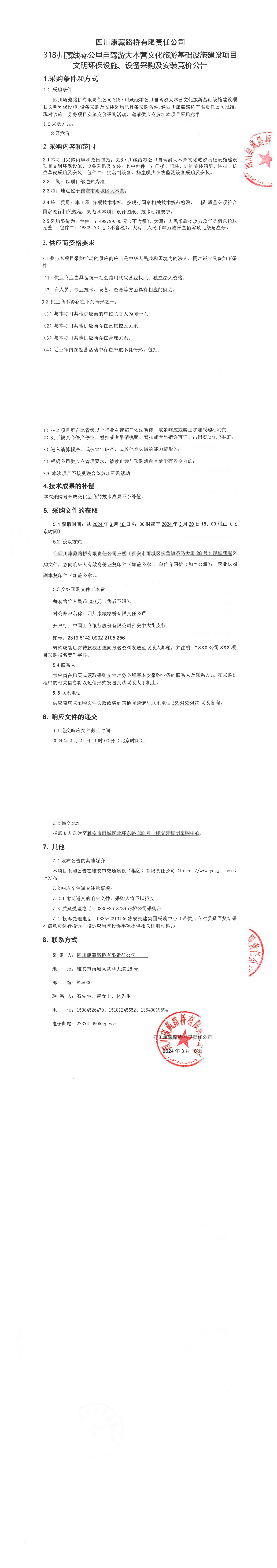 四川康藏路橋有限責任公司318·川藏公路零公里自駕游大本營文化旅游基礎設施建設項目文明環(huán)保設施、設備采購及安裝競價公告