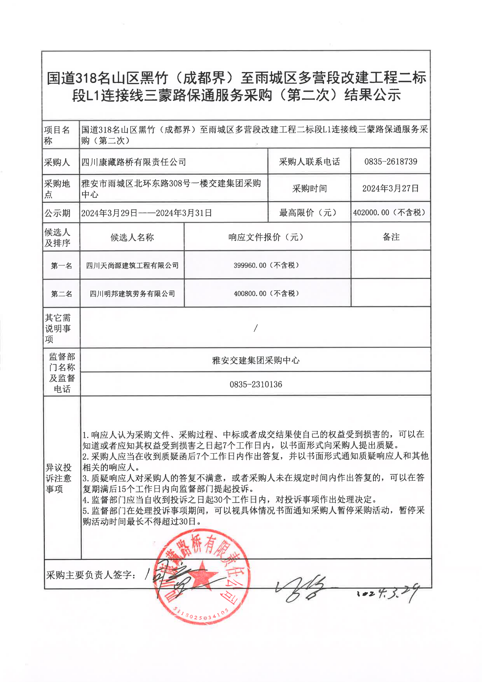 四川康藏路橋有限責任公司國道318名山區(qū)黑竹(成都界)至雨城區(qū)多營段改建工程二標段L1連接線三蒙路保通服務(第二次)結(jié)果公示