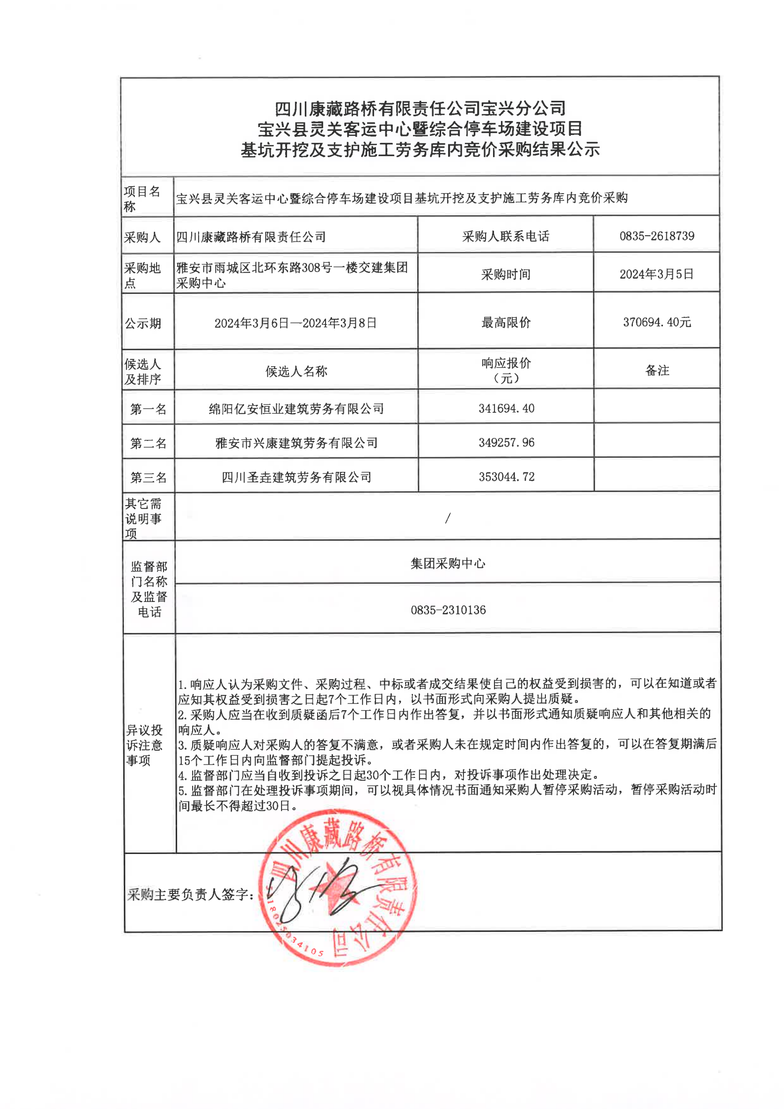 四川康藏路橋有限責(zé)任公司寶興縣靈關(guān)客運(yùn)站中心暨綜合停車場(chǎng)建設(shè)項(xiàng)目基坑降水施工勞務(wù)庫內(nèi)競價(jià)采購結(jié)果公示