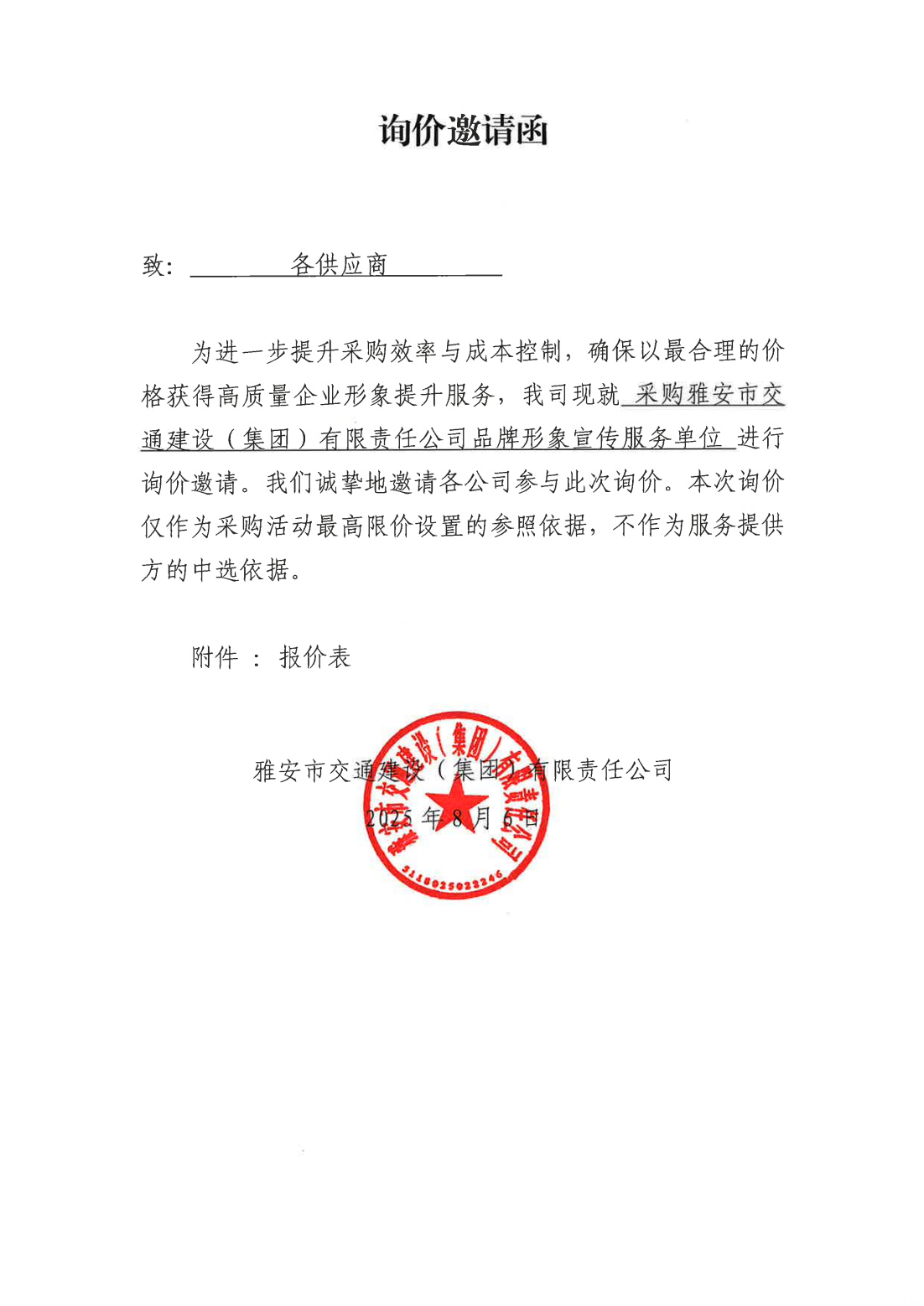 關(guān)于采購集團(tuán)品牌形象宣傳服務(wù)單位的詢價(jià)函