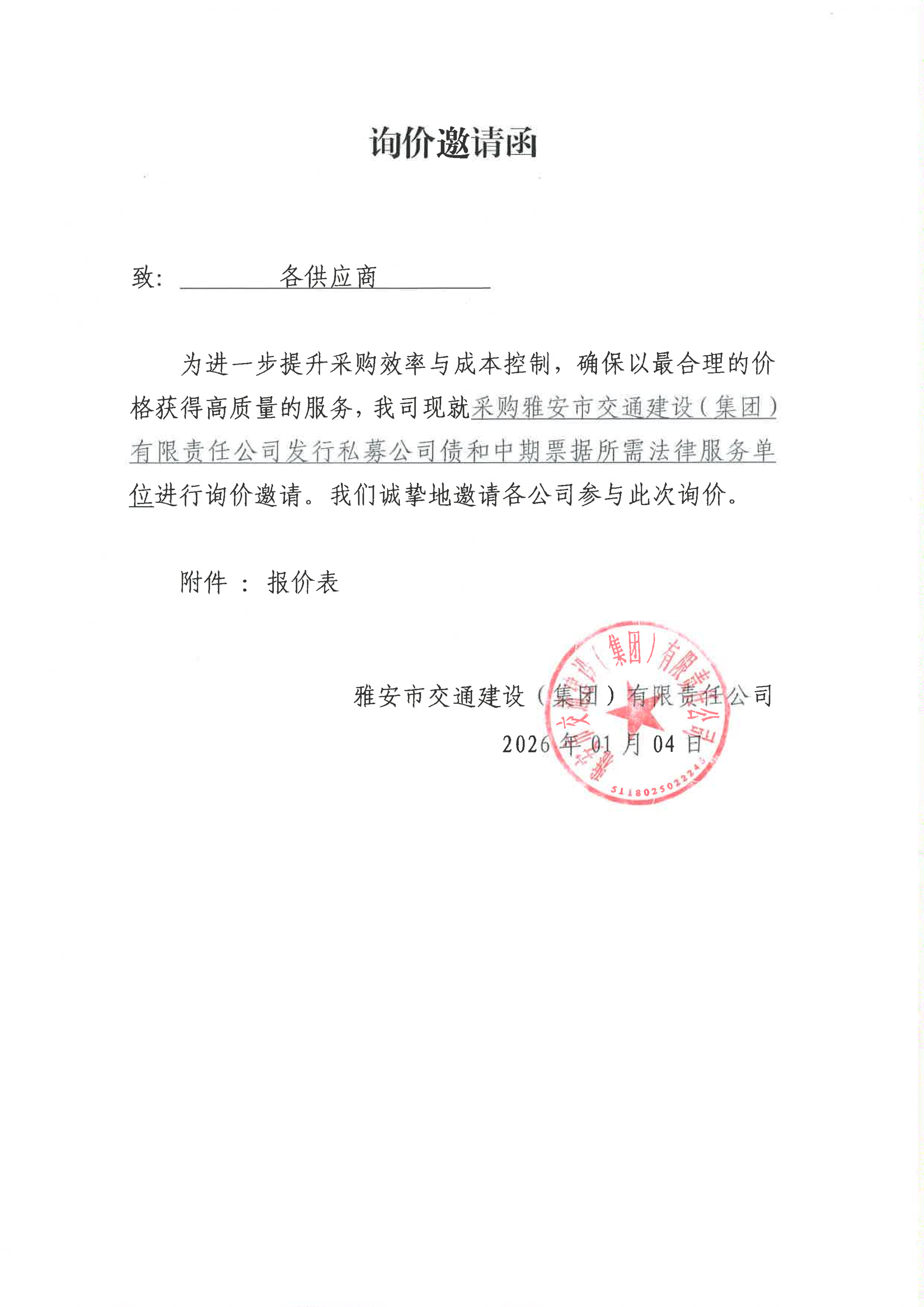 關(guān)于雅安市交通建設(shè)(集團(tuán))有限責(zé)任公司發(fā)行私募公司債和中期票據(jù)所需法律服務(wù)采購限價(jià)的詢價(jià)函