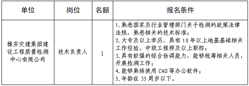根據(jù)發(fā)展需要,決定面向社會(huì)公開招聘雅安市交通建設(shè)(集團(tuán))有限責(zé)任公司(以下簡(jiǎn)稱“雅安交建集團(tuán)”)所屬子公司工作人員1名,現(xiàn)將有關(guān)事項(xiàng)公告如下: