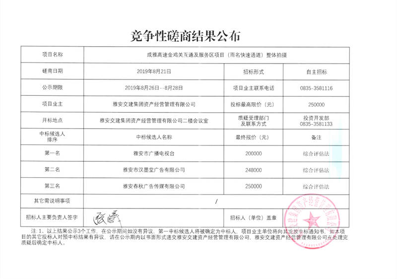 成雅高速金雞關互通及服務區(qū)項目(雨名快速通道)整體拍攝競爭性磋商結果公布