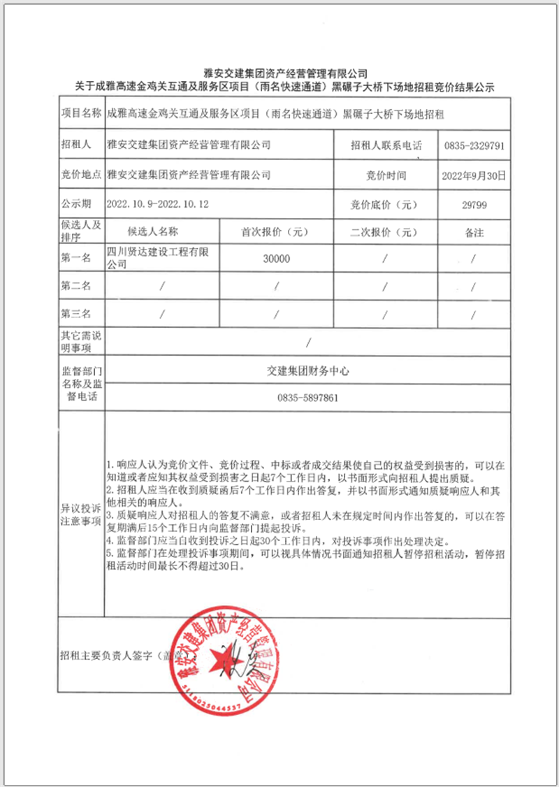 關于成雅高速金雞關互通及服務區(qū)項目(雨名快速通道)黑碾子大橋下場地招租競價結果公示
