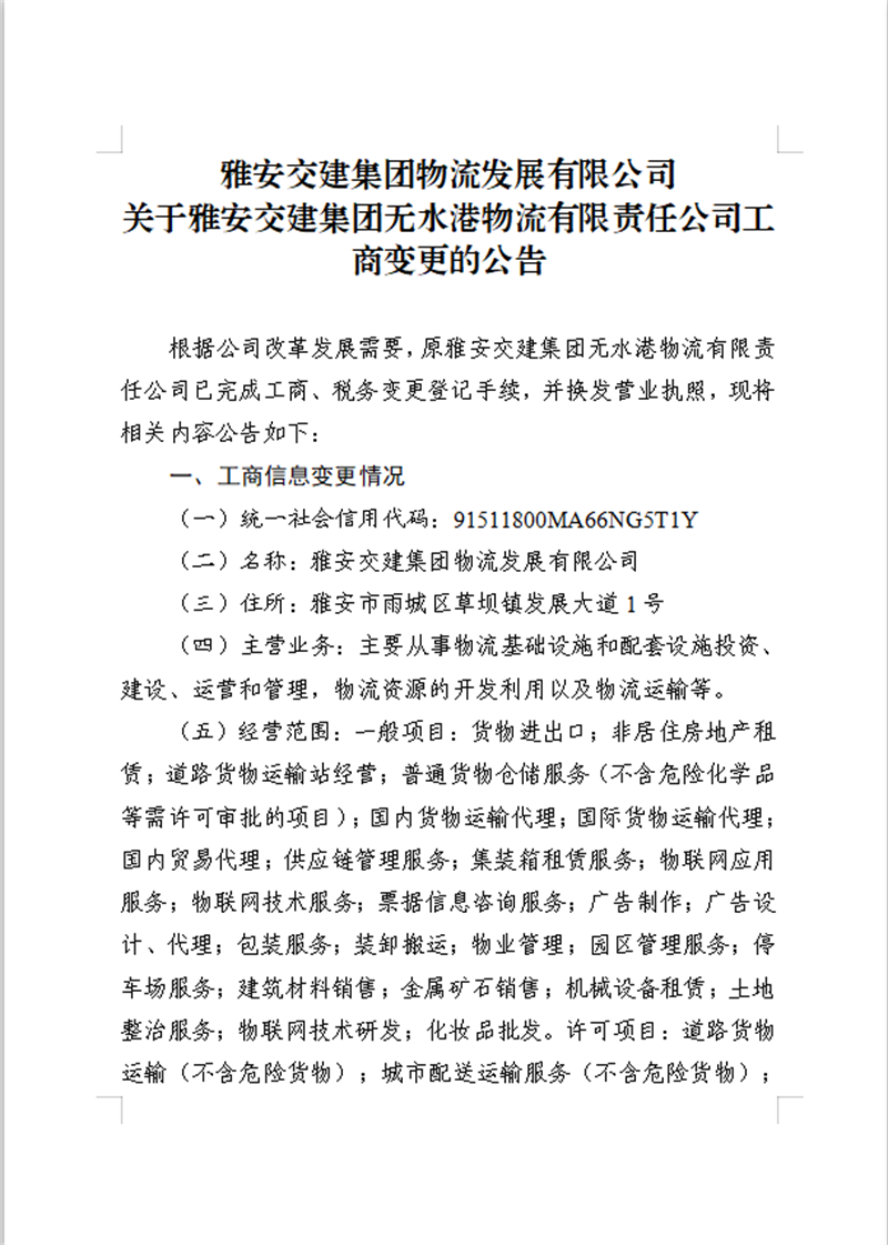 雅安交建集團(tuán)物流發(fā)展有限公司關(guān)于雅安交建集團(tuán)無水港物流有限責(zé)任公司工商變更的公告