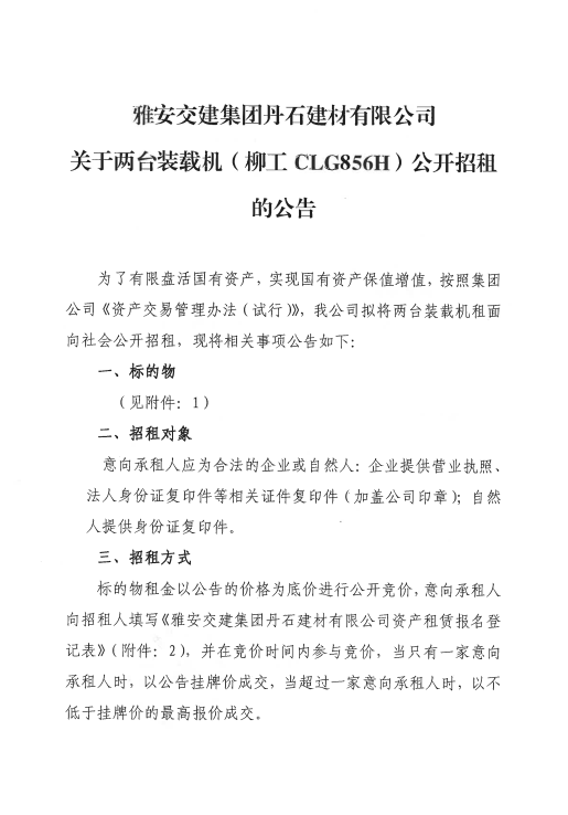 雅安交建集團(tuán)丹石建材有限公司關(guān)于2臺(tái)裝載機(jī)公開(kāi)招租的公告附件