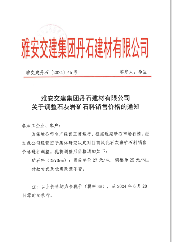 關(guān)于調(diào)整石灰?guī)r礦石料銷售價(jià)格的通知