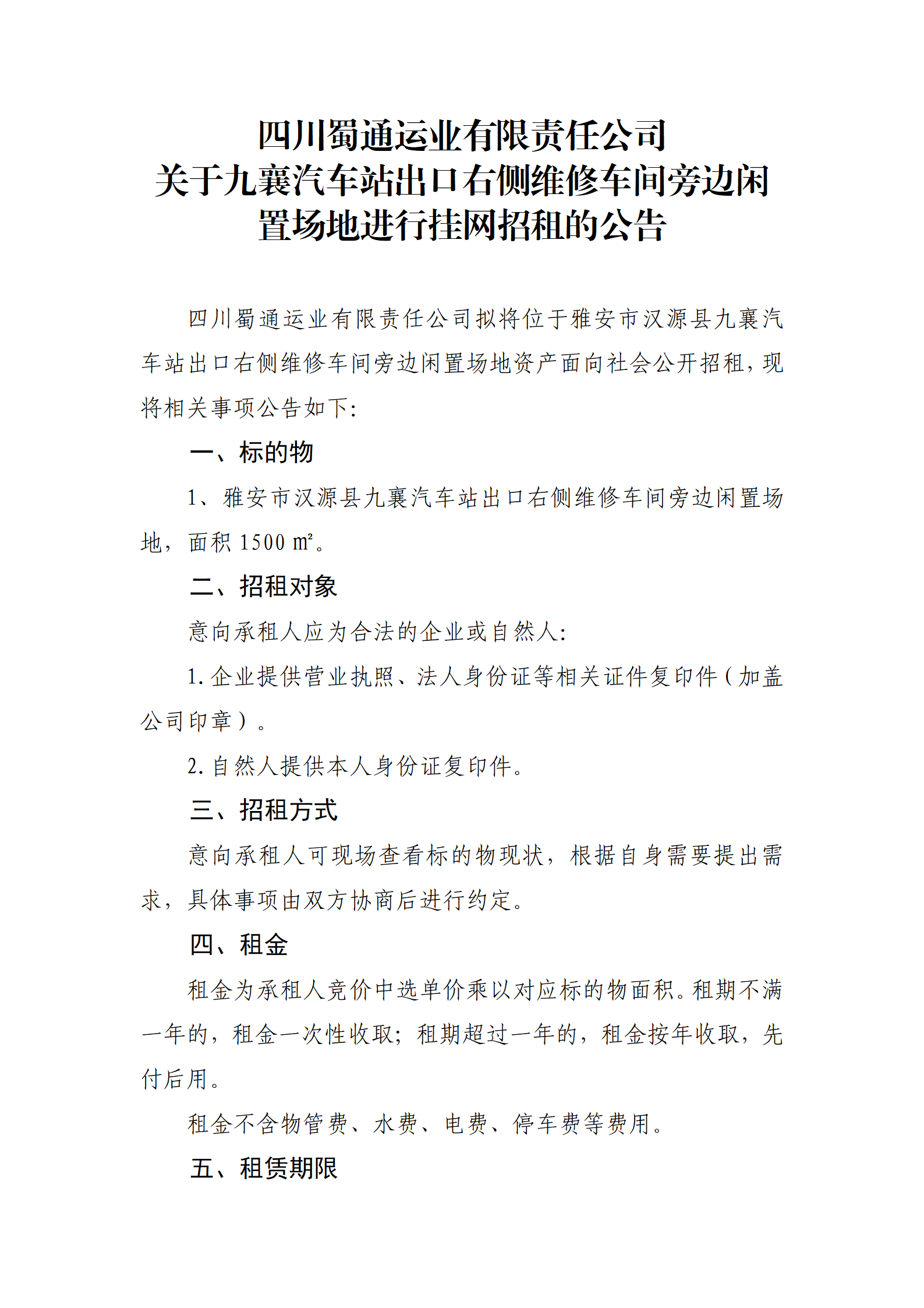 四川蜀通運業(yè)有限責(zé)任公司 關(guān)于九襄汽車站出口右側(cè)維修車間旁邊閑置場地進(jìn)行掛網(wǎng)招租的公告