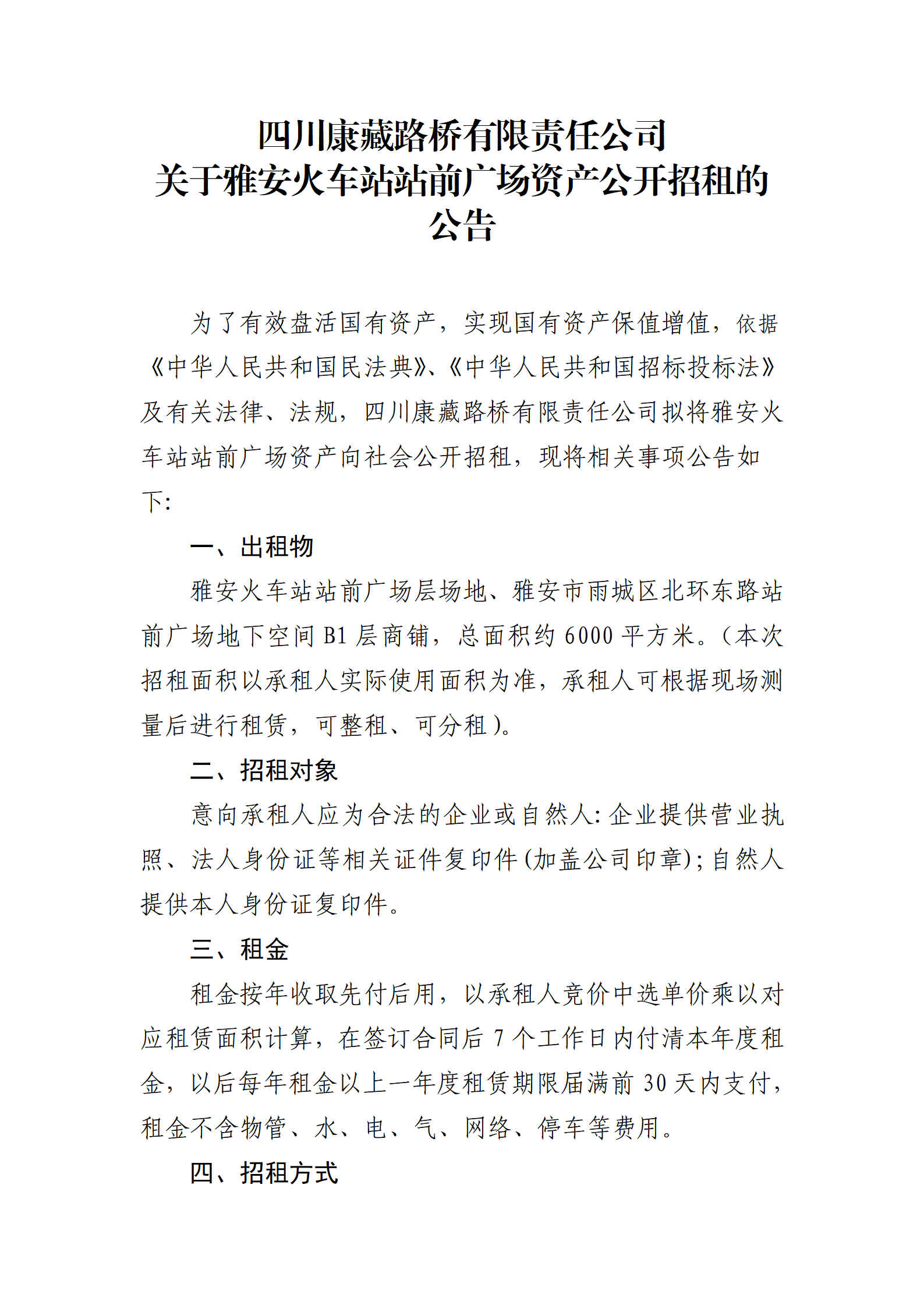 四川康藏路橋有限責任公司站前廣場資產(chǎn)招租公告