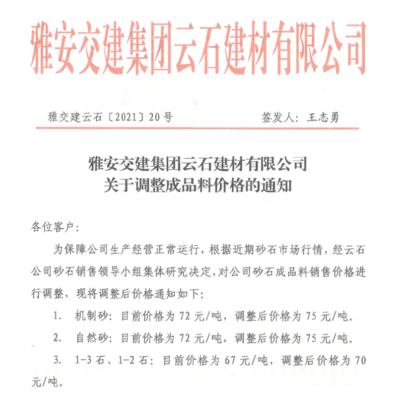 雅安交建集團(tuán)云石公司砂石骨料銷(xiāo)售價(jià)格情況表(2021.6.20)
