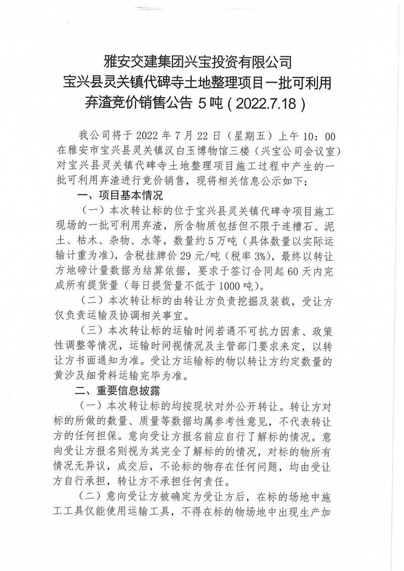 寶興縣靈關(guān)鎮(zhèn)代碑寺土地整理項(xiàng)目一批可利用棄渣競(jìng)價(jià)銷售公告7.15(5萬(wàn)噸)