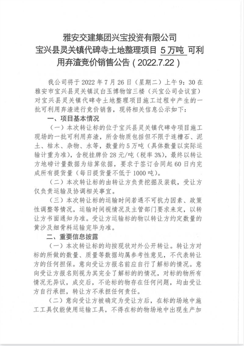 興寶公司寶興縣靈關鎮(zhèn)代碑寺土地整理項目10萬噸可利用棄渣競價銷售掛網(wǎng)公告掛網(wǎng)公告7.22(5萬噸)