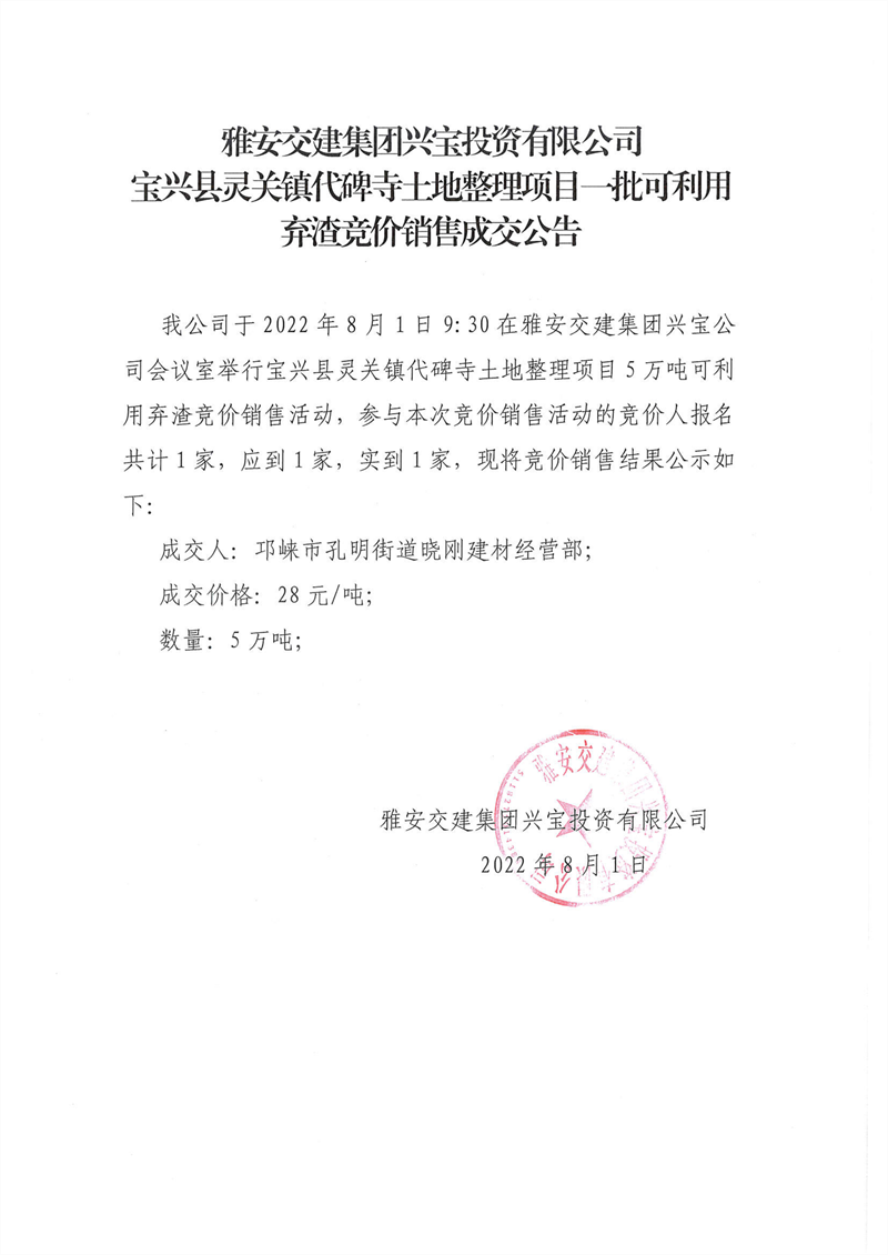 雅安交建集團(tuán)興寶投資有限公司靈關(guān)鎮(zhèn)代碑寺土地整理項(xiàng)目10萬噸可利用棄渣競(jìng)價(jià)銷售成交公告(2022.8.1)