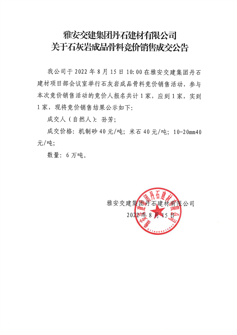 雅安交建集團丹石建材有限公司關(guān)于石灰?guī)r成品骨料競價銷售成交公告