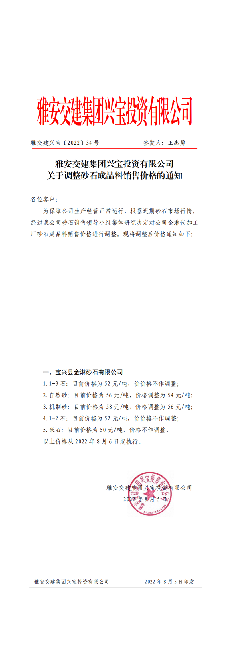 雅交建興寶〔2022〕34號 關(guān)于調(diào)整砂石成品料銷售價格的通知