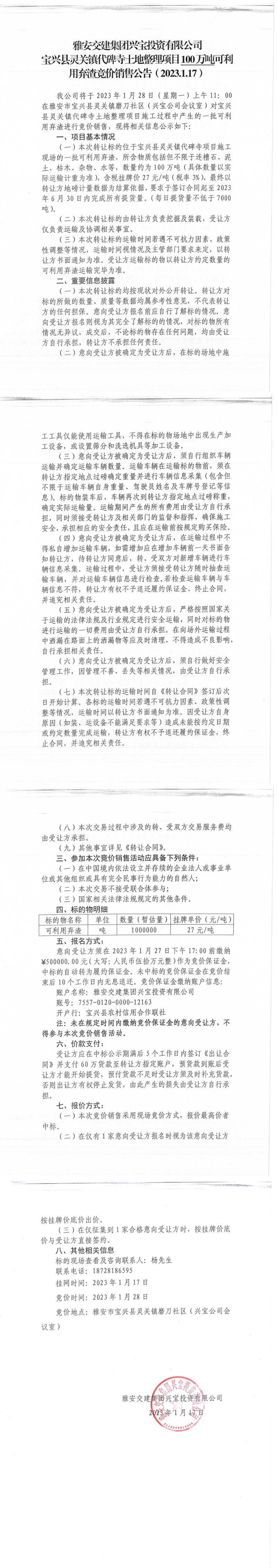 雅安交建集團(tuán)興寶投資有限公司靈關(guān)鎮(zhèn)代碑寺土地整理項(xiàng)目100萬(wàn)噸可利用棄渣競(jìng)價(jià)銷售公告(2023.1.17)