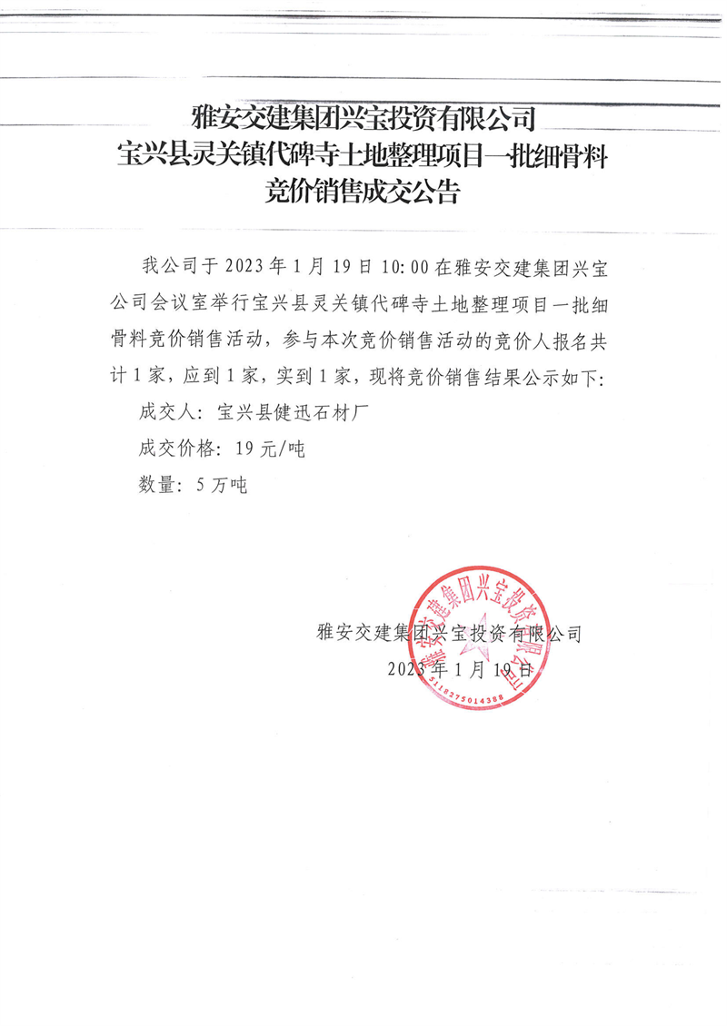 雅安交建集團(tuán)興寶投資有限公司代碑寺土地整理項(xiàng)目細(xì)骨料競(jìng)價(jià)銷售成交公告(2023.1.19)