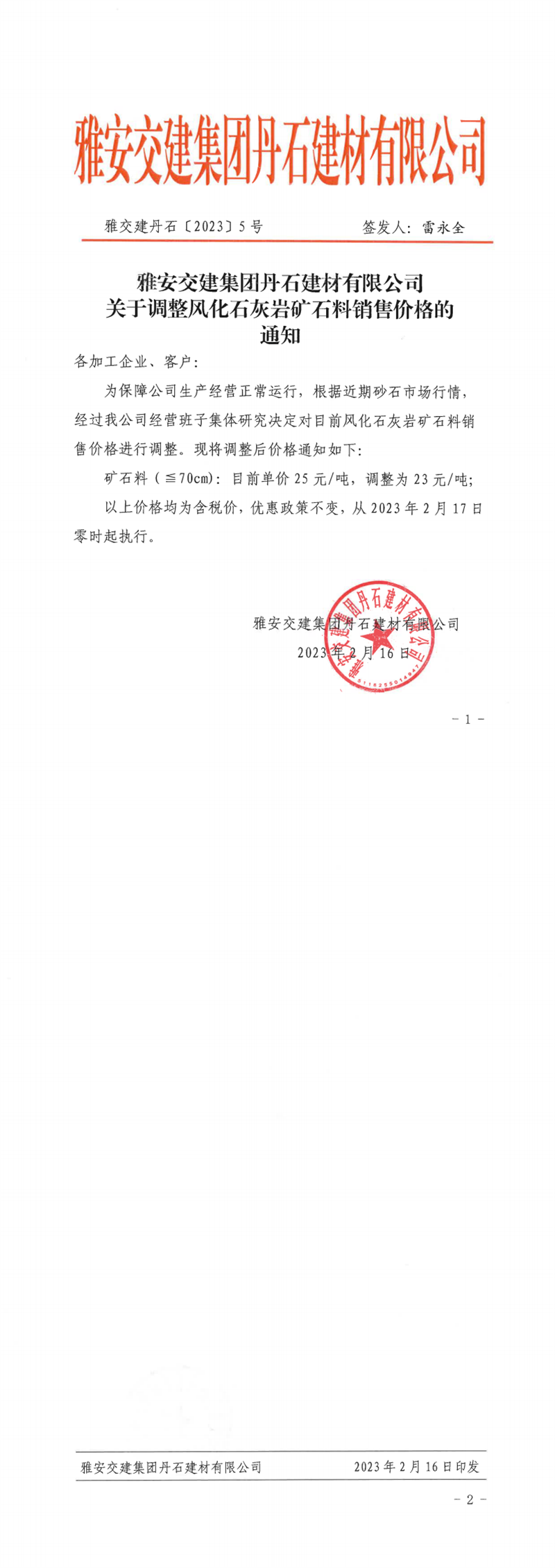 雅交建丹石(2023)5號調(diào)整風化石灰?guī)r礦料銷售價格的通知(2023.02.16)