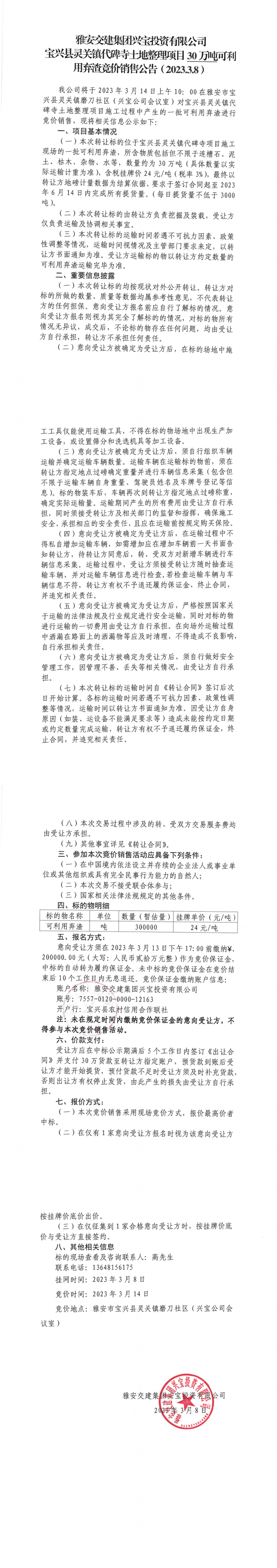 雅安交建集團(tuán)興寶投資有限公司靈關(guān)鎮(zhèn)代碑寺土地整理項(xiàng)目50萬噸可利用棄渣競(jìng)價(jià)銷售公告(2023.3.7)