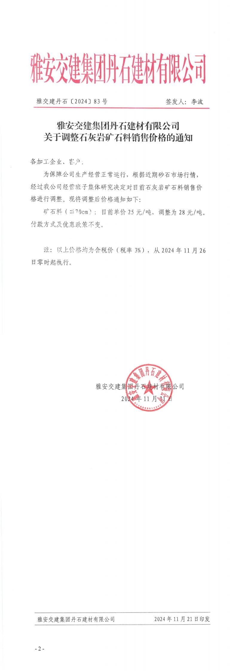 雅安交建集團丹石公司關(guān)于調(diào)整礦石料的通知(2024-11-22)