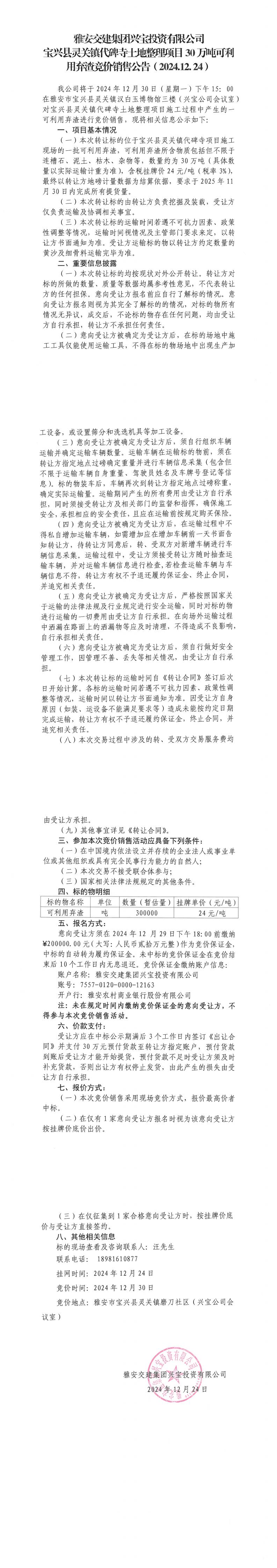 雅安交建集團(tuán)興寶投資有限公司靈關(guān)鎮(zhèn)代碑寺土地整理項(xiàng)目10萬(wàn)噸可利用棄渣競(jìng)價(jià)銷(xiāo)售公告(2024.12.24)